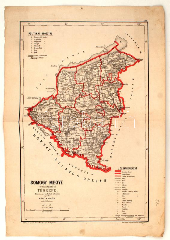 Beschreibung: 1880 Somogy megye közigazgatási térképe. Hátsek Ignác - A magyar szent korona országainak megyei térképei. Rajzolta Hátsek Ignácz. Budapest, 1880. Rautmann Frigyes Kiadó Hivatala Posner Károly Lajos. HatárszÃnezett kÅ‘nyomat,kis hibával a széleken, 38x27cm