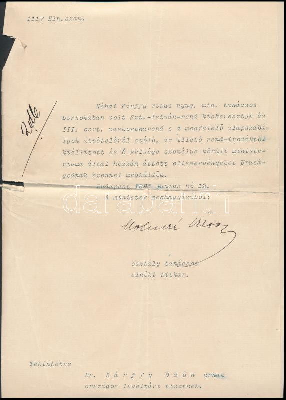 1895 Dr. Kárffy Ödönek, a néhai Kárffy Titusz (1825-1895) kitüntetéseinek elismervényei tárgyában íródott levél, Molnár Miklós osztály tanácsos, elnöki titkár alírásával, kisebb szakadással a hajtásoknál.