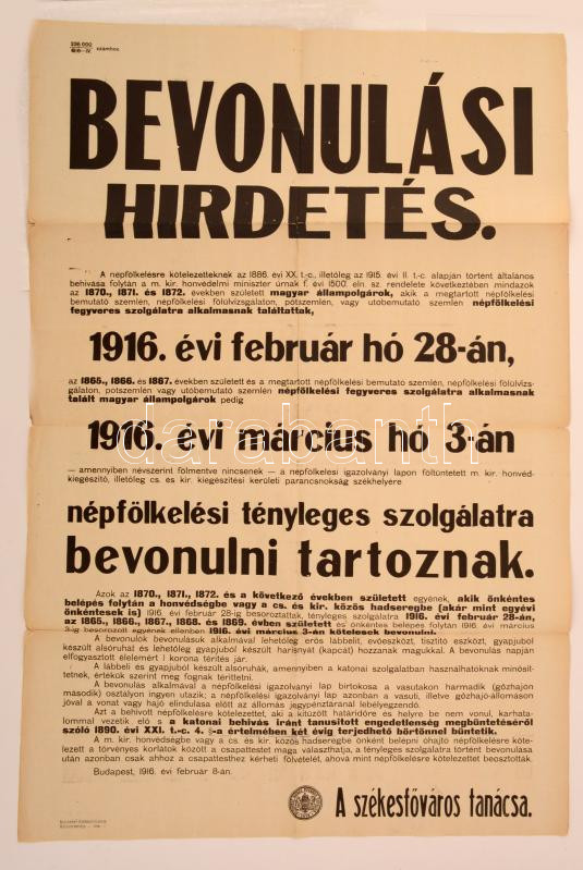 Beschreibung: 1916 Budapest főváros tanácsának felhívása besorozás tárgyában, nagyméretű plakát, a hajtások mentén szakadásokkal, 95×63 cm
