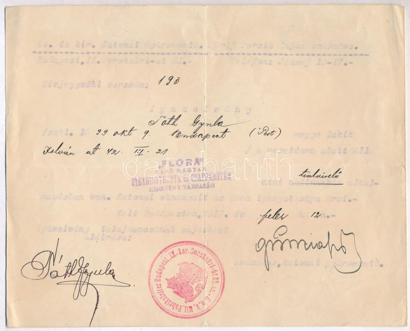 Beschreibung: 1917 Bp., Cs. és kir. katonai gyárvezetÅ‘ százados által kiállÃtott alkalmazási igazolás a Flora FelsÅ‘ Magyar Stearingyertya és Szappangyár Részvénytársaság pecsétjével, K.u.k. pecséttel