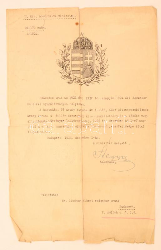 1924 Bp., M. kir. honvédelmi miniszter által kiadott nyugállományba he... https://www.darabanth.com/de/277-Fernauktion/277.0/Andere-Sammelgebiete/Militaria~26/1924-Bp-M-kir-honvedelmi-miniszter-altal-kiadott-nyugallomanyba-helyezesrol-szolo-okman~II1418943