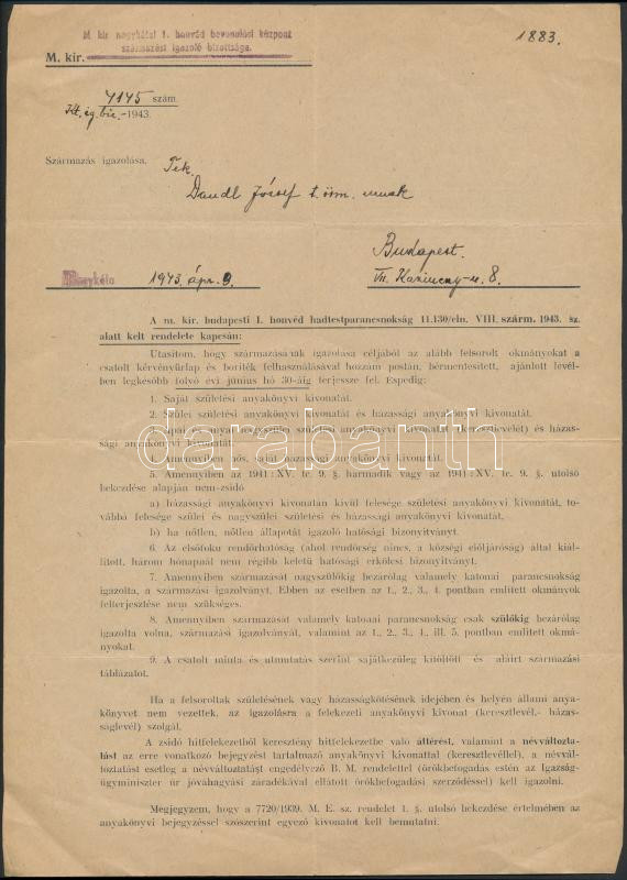 Beschreibung: 1943 Nagykáta, Az M. kir. nagykátai 1. honvéd bevonulási központ származási igazoló bizottsága által kiküldött származási igazoláshoz szükséges okmányok bekéréséről szóló tájékoztató nyomtatvány