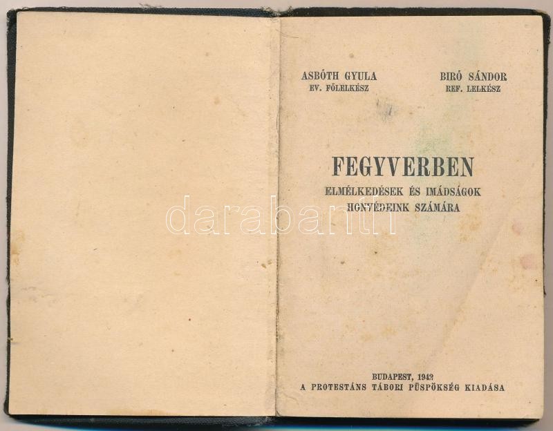 Asbóth Gyula-Bíró Sándor: Fegyverben, Elmélkedések és imádságok honvédeink számára. Budapest, 1942, Protestáns Tábori Püspökség. Sérült gerincű kiadói egészvászon kötés, 127 p.