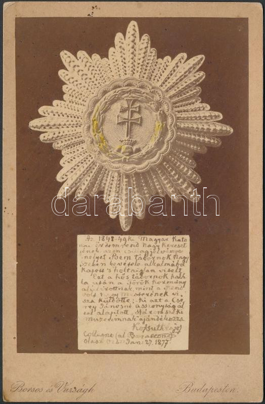 Beschreibung: cca 1877 A Bem Józsefnek adományozott magyar katonai érdemrend nagykeresztje, keményhátú fotó Borsos és Varságh budapesti műterméből, 17×11 cm
