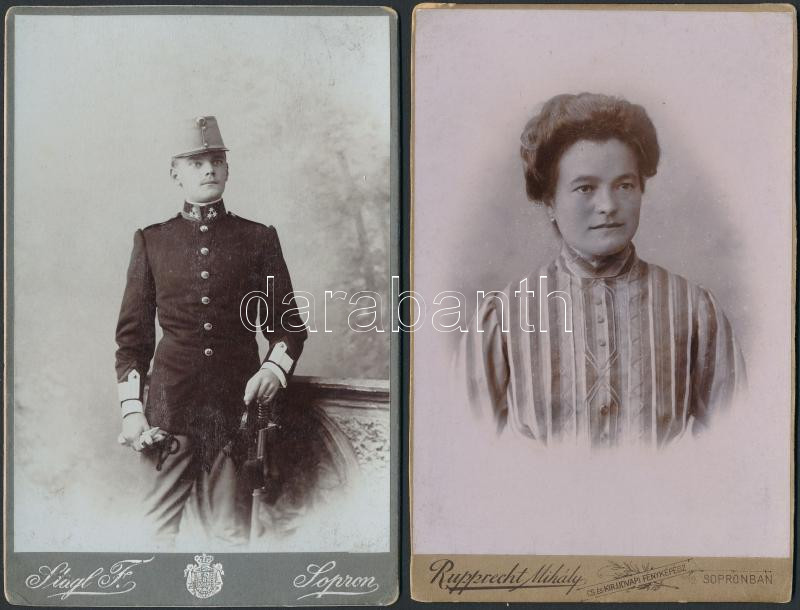 cca 1900 Sopron, egy magyar őrmester és egy asszony portréja Stagl F. és Rupprecht Mihály soproni műtermeiből, 2 db keményhátú kabinetfotó 16.5×10.5 cm