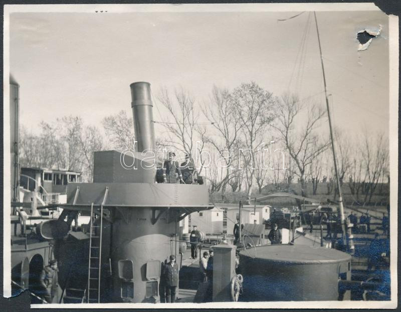 cca 1914-15 SMS Bodrog, Temes-osztályú monitorhajó valószínűleg a zimonyi kikötőben a Szerbia elleni hadjárat idején. Sérült fotó / Hungarian monitor ship in the port of Zemun (?) during the Serbian campaign of World War I, damaged condition, 8×10.5 cm