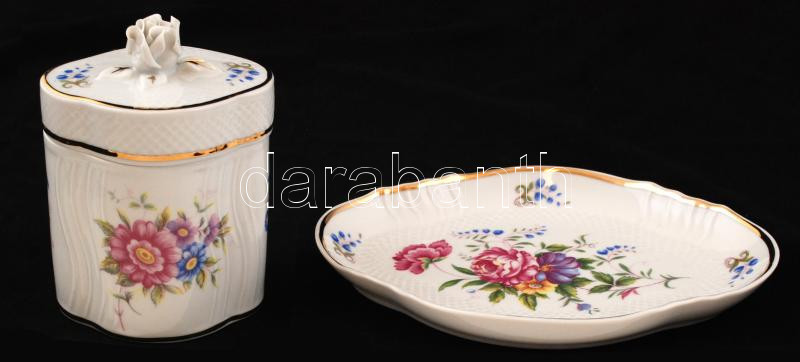 Beschreibung: Hollóházi matricás rózsákkal díszített (kis lepattanások) bonbonniere és tálka szett. m: 12, h: 20 cm