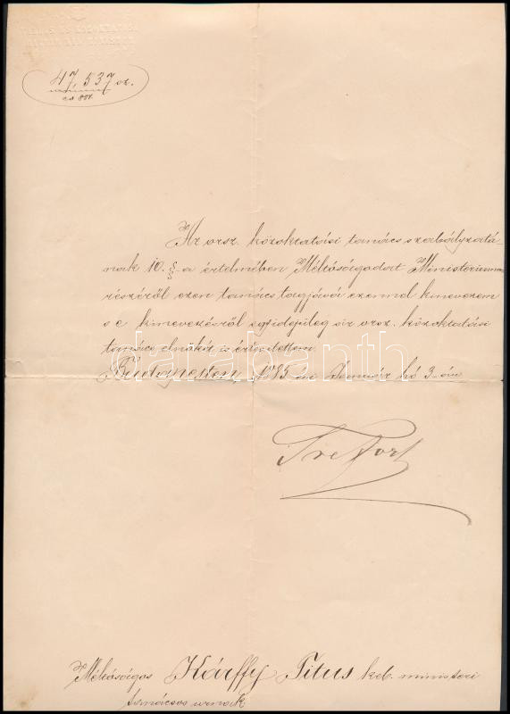 1885 Kárffy Titusz (1825-1895) miniszteri tanácsos kinevezése a közoktatási tanácsba, Trefort Ágostonnak (1817-1888), a Tisza Kálmán-kormány vallás és közoktatási miniszterének (1875-1888) az aláírásával, a hajtásoknál kisebb szakadásokkal.