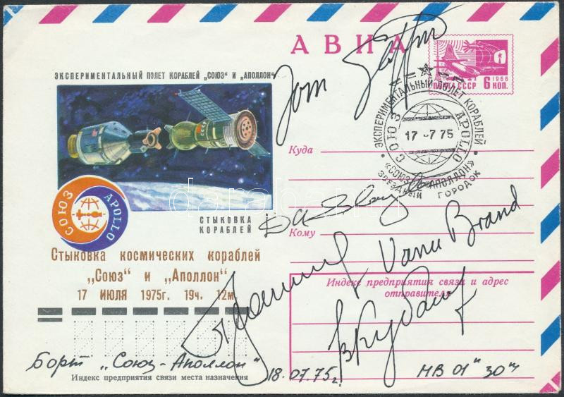 1975 A Szojuz-Apollo program résztvevőinek aláírásai emlékborítékon: Alekszej Leonov (1934- ), Valerij Kubaszov (1935-2014), Thomas P. Stafford (1930- ), Vance D. Brand (1931- ) és Deke Slayton (1924-1993) /
