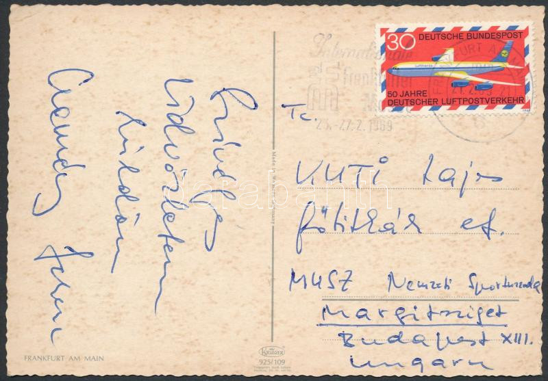 Beschreibung: Kemény Ferenc (1932- ) vízilabdázó aláírása Kuti Lajosnak, a Magyar Úszószövetség főtitkárának küldött levelezőlapon