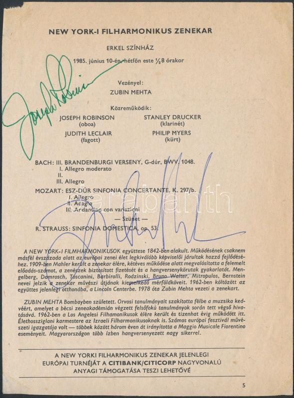 Beschreibung: Zubin Mehta (1936-) indiai karmester és Joseph Robinson zenész aláírása műsoros nyomtatványon, 19x14cm