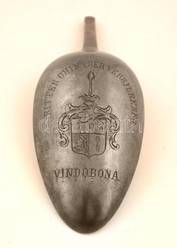 Beschreibung: Ritter China bécsi ezüstöző ezüstözött, címeres reklám kanálfeje, 10,5×4,5 cm