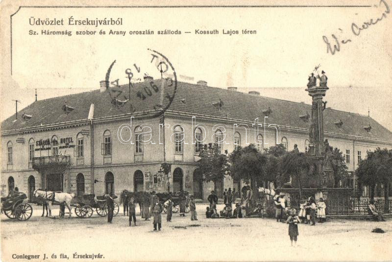 Beschreibung: Érsekújvár, Nové Zámky; Szentháromság szobor, Arany Oroszlán Szálloda, Kossuth Lajos tér, kiadja Conlegner J. és fia / statue, hotel, square