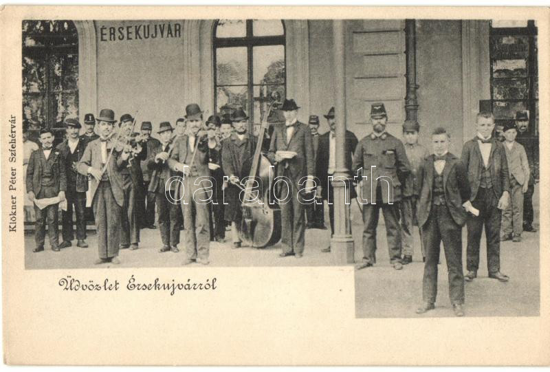 Beschreibung: Érsekújvár, Nové Zamky; Vasútállomás, állomási cigány vonós zenészek, kiadja Klökner Péter / railway station, gypsy musicians