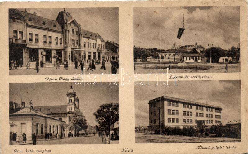 Léva, Levice; Városi Nagyszálló, Lyceum, országzászló, Állami polgári ... https://www.darabanth.com/de/277-Fernauktion/277.0/Ansichtskarten/Slowakei~300011/Leva-Levice-Varosi-Nagyszallo-Lyceum-orszagzaszlo-Allami-polgari-iskola-hotel-lyceu~II1424256