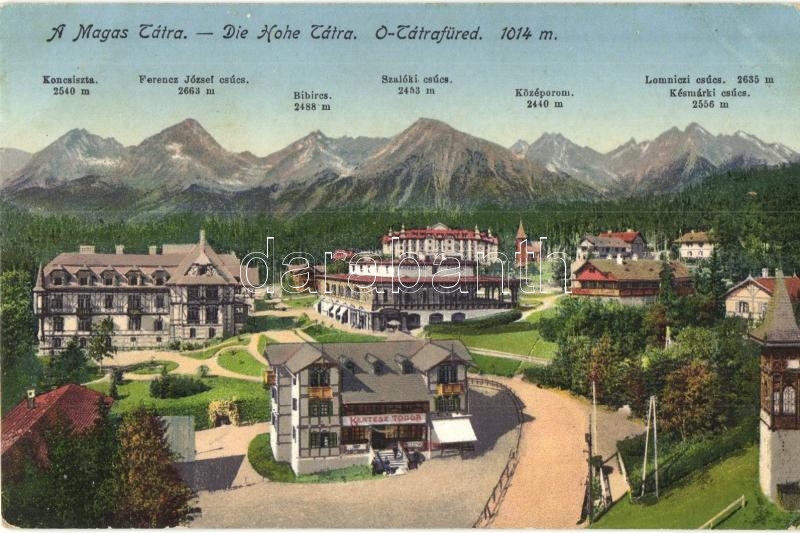 Beschreibung: Ótátrafüred, Stary Smokovec; Látkép, kávéház, Kertész Tódor üzlete, kiadja Divald és Monostory / general view, café, shop
