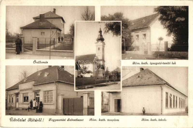 Réte, Reca; Őrállomás, Fogyasztási szövetkezet, Római katolikus iskola és igazgatói-tanítói lak / guards' station, cooperative shop, church and directos's appartment