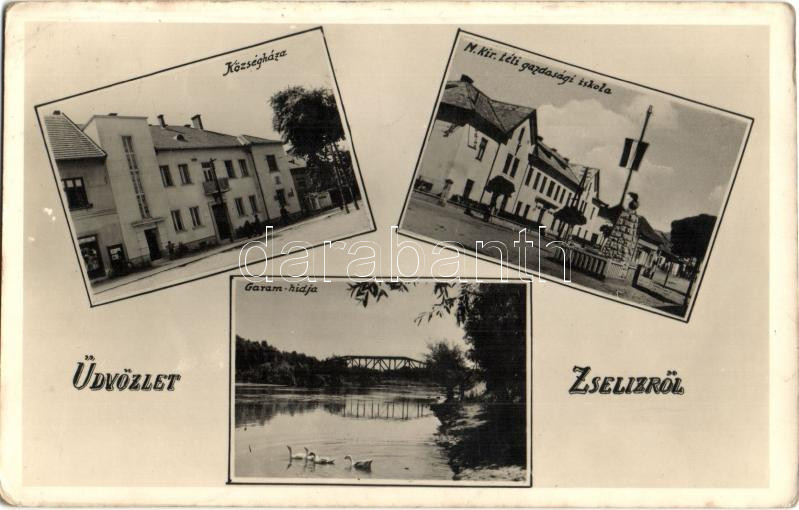 Zselíz, Zeliezovice; Magyar királyi téli gazdasági iskola, országzászló, községháza, Garam hídja, kiadja a Hangya Szövetkezet / economics school, Hungarian national flag, town hall, bridge (EK)