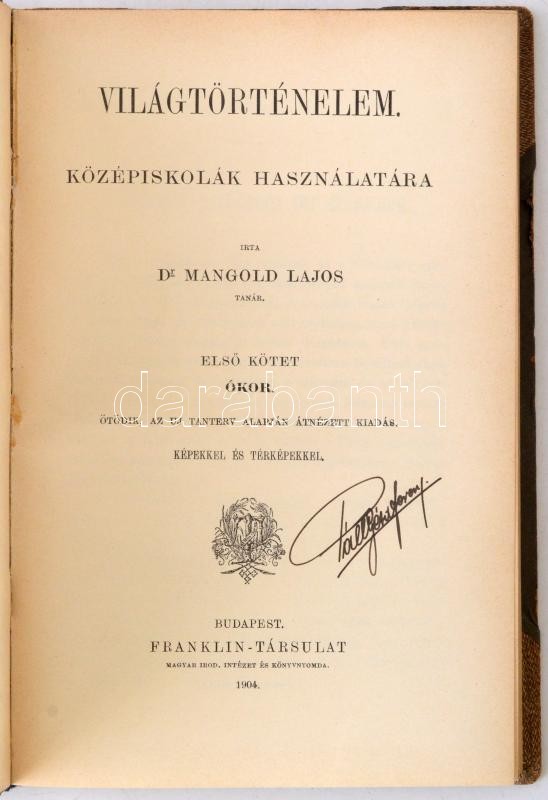 Dr. Mangold Lajos: Világtörténelem. I. Ókor. Ötödik, az uj tanterv alapján átnézett kiadás. Budapest, 1904, Franklin-Társulat. Átkötött félvászon kötés. A borítója foltos. Az elejére pár oldal jegyzetet bekötöttek pluszba. A szennylapon egy kép a lepantói csatáról. A könyvben tollal jegyzetek, aláírások.