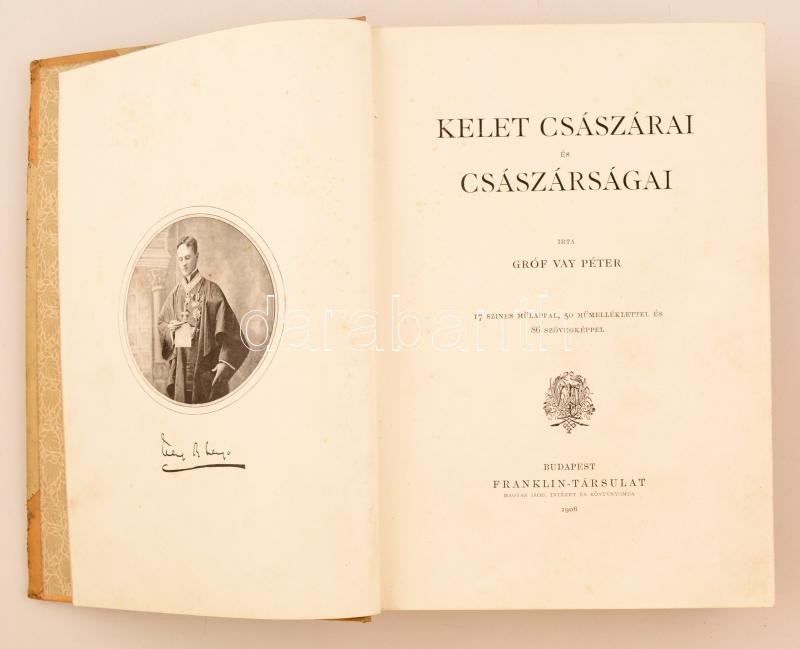 Gróf Vay Péter: Kelet császárai és császárságai. Budapest, 1906, Franklin-Társulat. Kiadói foltos, festett egészvászon kötésben, foltos lapélekkel, szövegközti és egészoldalas gazdagon fekete-fehér fotókkal, és 17 színes műlappal illusztrálva.