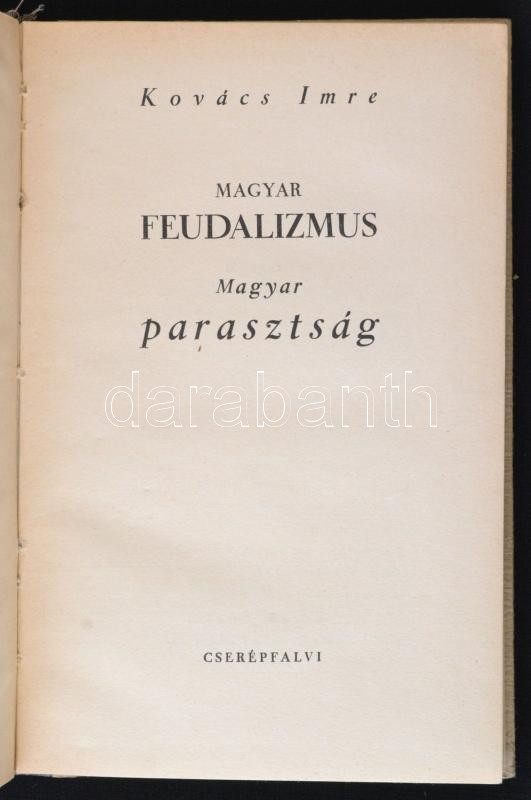 Kovács Imre: Magyar feudalizmus, magyar parasztság. Budapest, 1943, Cserépfalvi, 142+1 p. Első kiadás. Kiadói félvászon kötés, picit sérült gerinccel, egyébként jó állapotban.