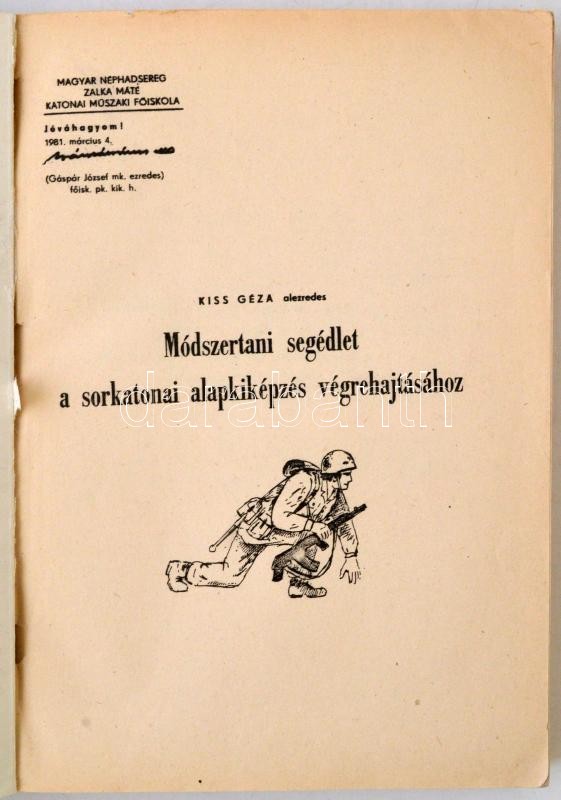 Kiss Géza: Módszertani segédlet a sorkatonai alapkiképzés végrehajtásához. Budapest, 1981, Zalka Máté Katonai Műszaki Főiskola, 315 p. Kiadói papírkötés. Volt könyvtári példány. A borítón ajándékozási sorok és aláírások.