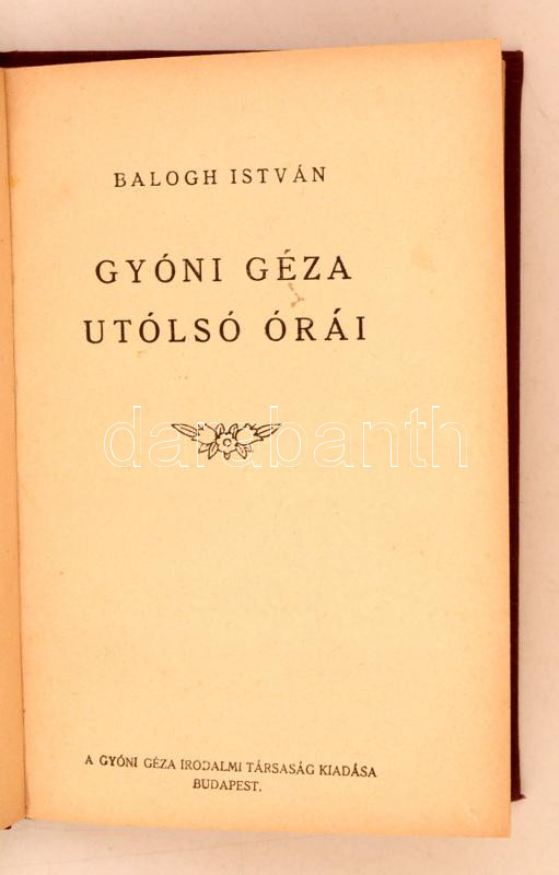 Balogh István: Gyóni Géza utólsó órái. Budapest, é.n., Gyóni Géza Irod... https://www.darabanth.com/de/277-Fernauktion/277.0/Bucher/Bucher-Sonstige-Raritaten~45/Balogh-Istvan-Gyoni-Geza-utolso-orai-Budapest-en-Gyoni-Geza-Irodalmi-Tarsasag-kiad~II1397568