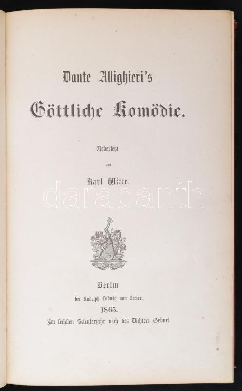 Dante Alighieri: Göttliche Komödie. Berlin, 1865, Rudolph Ludwig von D... https://www.darabanth.com/de/277-Fernauktion/277.0/Bucher/Bucher-Sonstige-Raritaten~45/Dante-Alighieri-Gottliche-Komodie-Berlin-1865-Rudolph-Ludwig-von-Decker-Aranyozott-lapszelek~II1425221