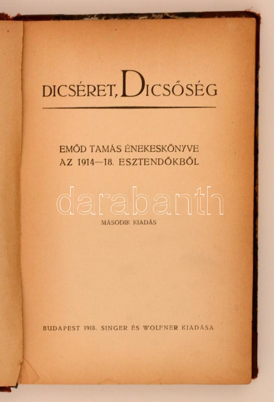 Dicséret, Dicsőség. Emőd Tamás énekeskönyve az 1914-18. esztendőkből. ... https://www.darabanth.com/de/277-Fernauktion/277.0/Bucher/Bucher-Sonstige-Raritaten~45/Dicseret-Dicsoseg-Emod-Tamas-enekeskonyve-az-1914-18-esztendokbol-Budapest-1918-Singe~II1417054