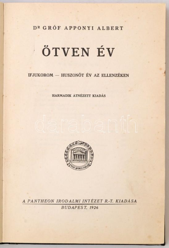 Dr. Gróf Apponyi Albert: Emlékirataim. Ötven Év. Ifjukorom - Huszonöt év az ellenzékben. Budapest, 1926, Pantheaon Irodalmi Intézet Rt. Harmadik átnézett kiadás. Átkötött picit kopott félvászon kötés.