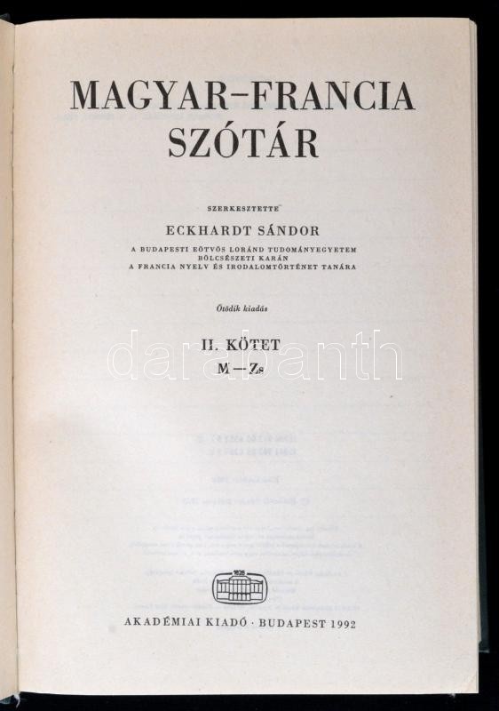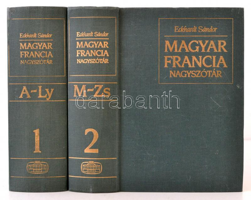 Eckhardt Sándor: Magyar-francia Nagyszótár I-II. Budapest, 1992, Akadémiai Kiadó. Kiadói egészvászon kötés, az első kötet javított gerinccel, borítóval, de alapvetően jó állapotban.
