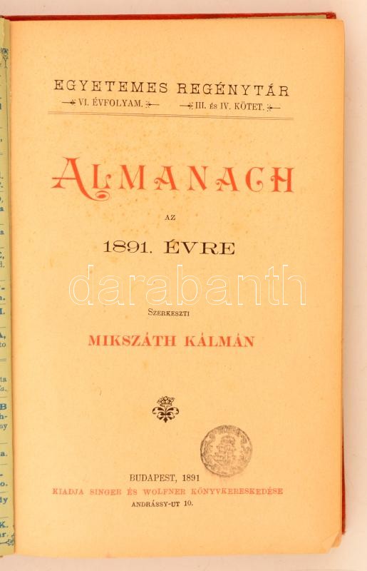 Egyetemes Regénytár. Almanach az 1891. évre. Szerkeszti Mikszáth Kálmá... https://www.darabanth.com/de/277-Fernauktion/277.0/Bucher/Bucher-Sonstige-Raritaten~45/Egyetemes-Regenytar-Almanach-az-1891-evre-Szerkeszti-Mikszath-Kalman-Budapest-1891-Singe~II1421776