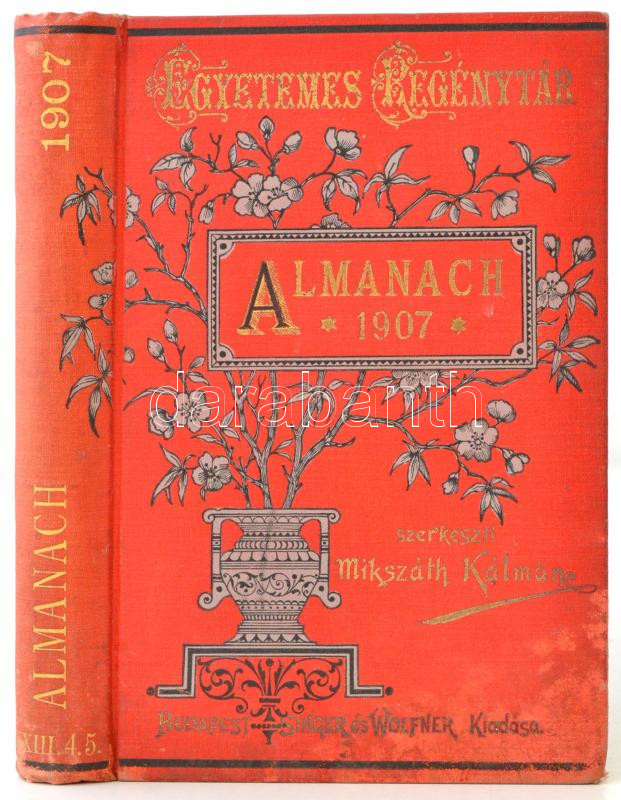 Egyetemes Regénytár. Almanach az 1907. évre. Szerkeszti Mikszáth Kálmán. Budapest, 1907, Singer és Wolfner. Kiadói aranyozott, festett, illusztrált egészvászon (Gottermayer-féle) kötés, márványozott lapélekkel, picit kopott, picit foltos, de alapvetően jó állapotban.