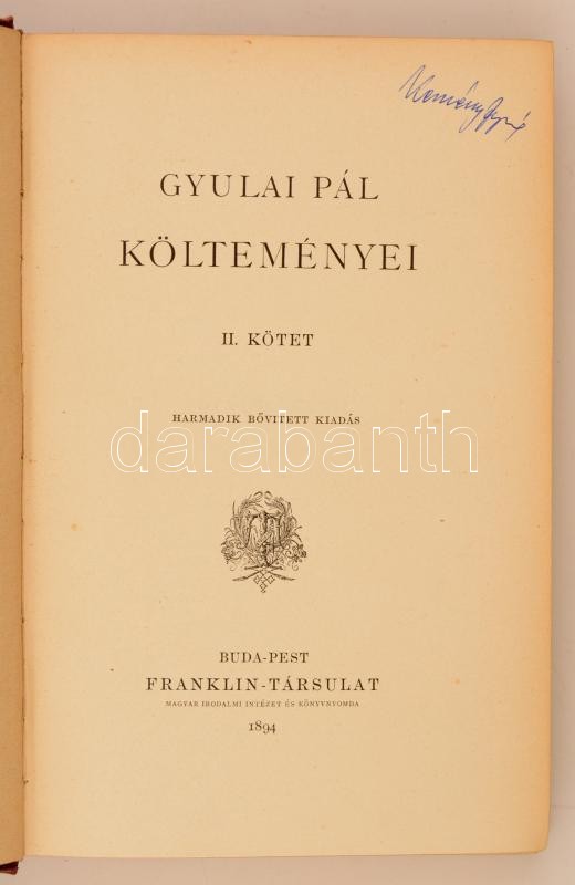 Gyulai Pál költeményei II. kötet. Budapest, 1894, Franklin-Társulat. K... https://www.darabanth.com/de/277-Fernauktion/277.0/Bucher/Bucher-Sonstige-Raritaten~45/Gyulai-Pal-koltemenyei-II-kotet-Budapest-1894-Franklin-Tarsulat-Kiadoi-aranyozott-egeszv~II1425385