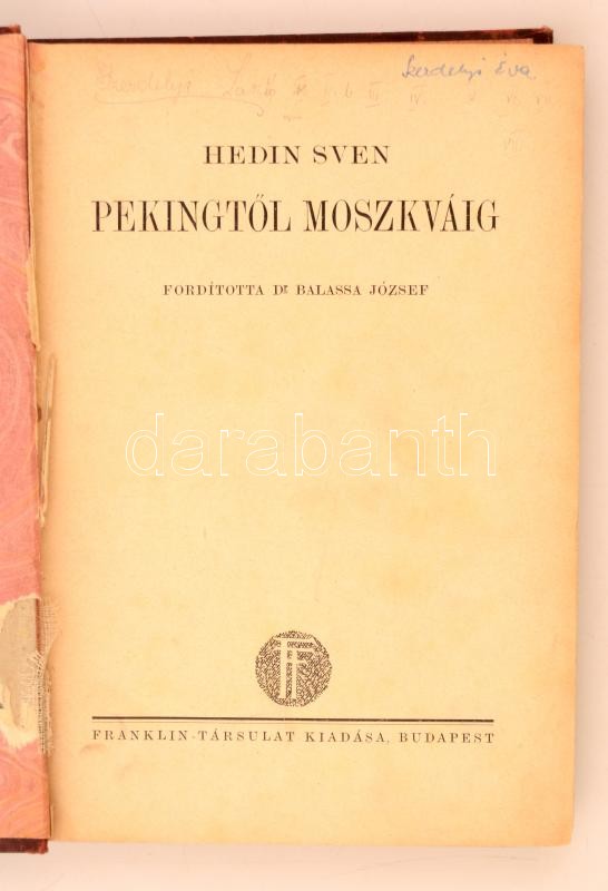 Hedin, Sven: Pekingtől Moszkváig. Bp., é. n., Franklin. Megviselt, dís... https://www.darabanth.com/de/277-Fernauktion/277.0/Bucher/Bucher-Sonstige-Raritaten~45/Hedin-Sven-Pekingtol-Moszkvaig-Bp-e-n-Franklin-Megviselt-diszes-vaszonkotesben~II1418088