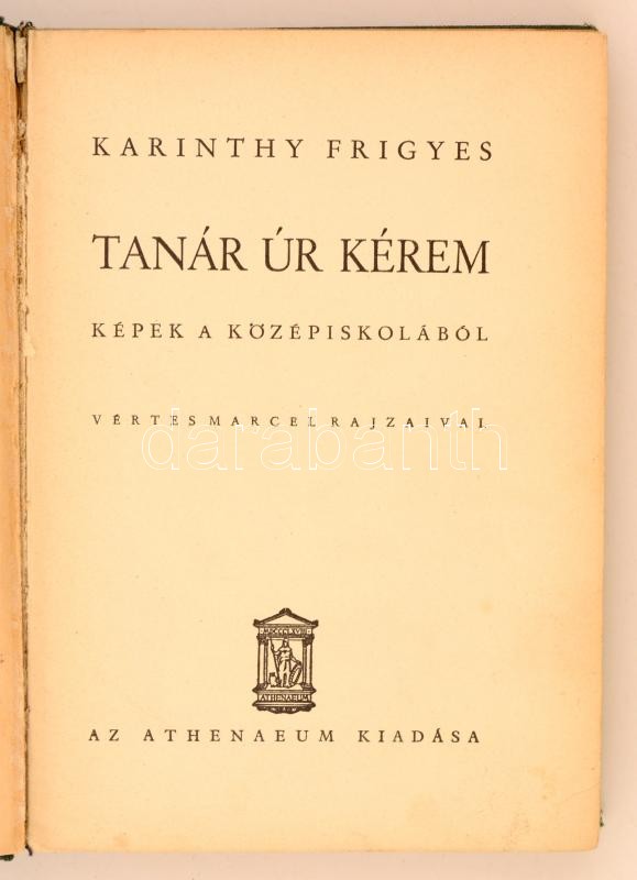 Karinthy Frigyes: Tanár úr kérem. Képek a középiskolából. Vértes Marcel rajzaival. Budapest, é.n., Athenaeum. Kiadói aranyozott egészvászon, picit kopott borítóval, picit laza fűzéssel, ex libris-szel.