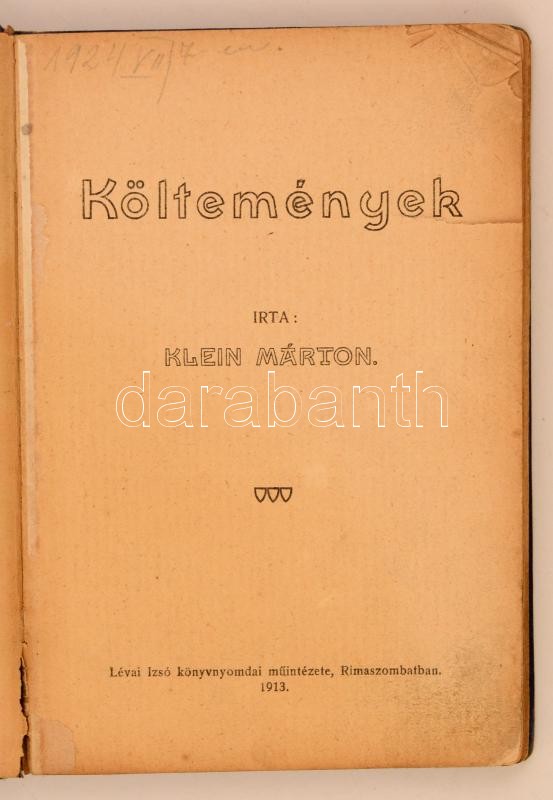 Klein Márton: Költemények. Rimaszombat, 1913, Lévai Izsó. Kopott, kics... https://www.darabanth.com/de/277-Fernauktion/277.0/Bucher/Bucher-Sonstige-Raritaten~45/Klein-Marton-Koltemenyek-Rimaszombat-1913-Levai-Izso-Kopott-kicsit-serult-diszes-vasz~II1417651