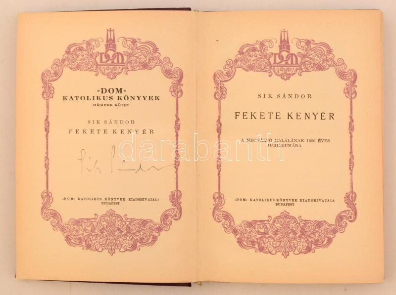 Sík Sándor: Fekete kenyér. Budapest, 1931, DOM Katolikus Könyvek Kiadóhivatal. Kiadói kopottas gerincű aranyozott egészvászon kötés, Jaschik Álmos rajzaival. A szerző által aláírt példány. Első kiadás.
