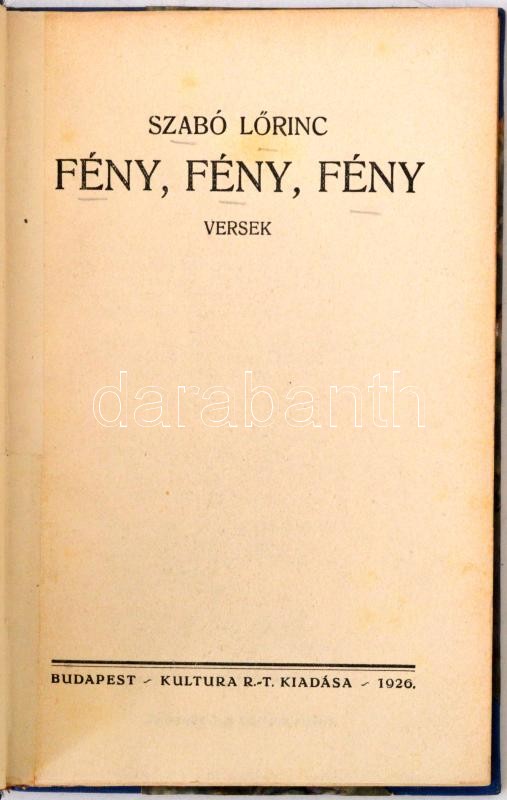 Szabó Lőrinc: Fény, fény, fény. Versek. Budapest, 1926, Kultura R.-T. ... https://www.darabanth.com/de/277-Fernauktion/277.0/Bucher/Bucher-Sonstige-Raritaten~45/Szabo-Lorinc-Feny-feny-feny-Versek-Budapest-1926-Kultura-R-T-Felvaszon-koteseben~II1402772