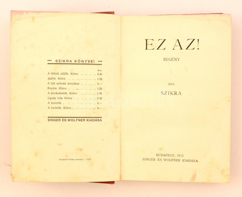 Szikra: Ez az! Budapest, 1915, Singer és Wolfner. Kiadói aranyozott eg... https://www.darabanth.com/de/277-Fernauktion/277.0/Bucher/Bucher-Sonstige-Raritaten~45/Szikra-Ez-az-Budapest-1915-Singer-es-Wolfner-Kiadoi-aranyozott-egeszvaszon-kotes-a-gerin~II1422004