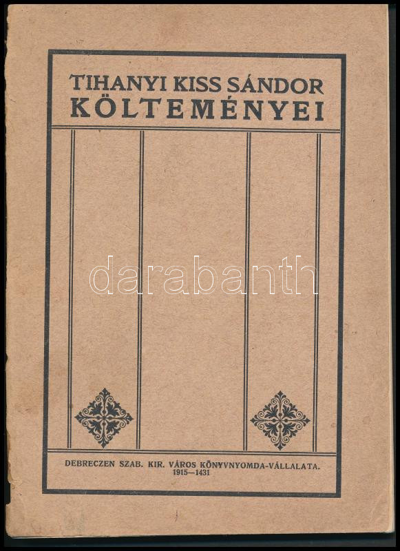 Tihanyi Kiss Sándor költeményei. Debrecen, 1915, Városi Könyvnyomda. E... https://www.darabanth.com/de/277-Fernauktion/277.0/Bucher/Bucher-Sonstige-Raritaten~45/Tihanyi-Kiss-Sandor-koltemenyei-Debrecen-1915-Varosi-Konyvnyomda-Elso-kiadas-Serult-ge~II1422334