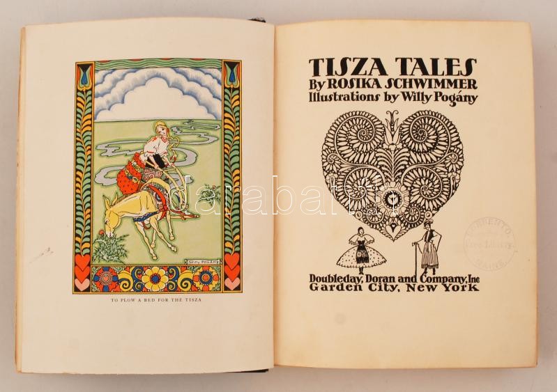 Tisza Tales by Rosika Schwimmer. Illustrations by Willy Pogany. Doubleday, Doran and Co., 1928, New York. Stated first edition. 225 p pages, 8 color plates and 12 black and white illustrations. Navy blue cloth-bound, faded on the cover plate and on the spine, cracked hinge. Library ownership stamps and annotations.