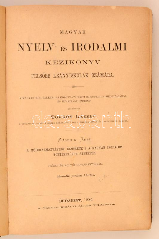 Torkos László: Magyar nyelv- és irodalmi kézikönyv felsőbb leányiskolák számára. 2. köt. Bp., 1886, Magyar Királyi Egyetemi Nyomda. Javított gerincű félvászon kötésben, egyébként jó állapotban.
