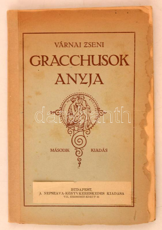Várnai Zseni: Gracchusok Anyja. Budapest, é.n., Népszava-Könyvkereskedés. Második kiadás. Kiadói papírkötésben. A borítója sérült, megviselt állapotban. A címlapon a szerző aláírásával.