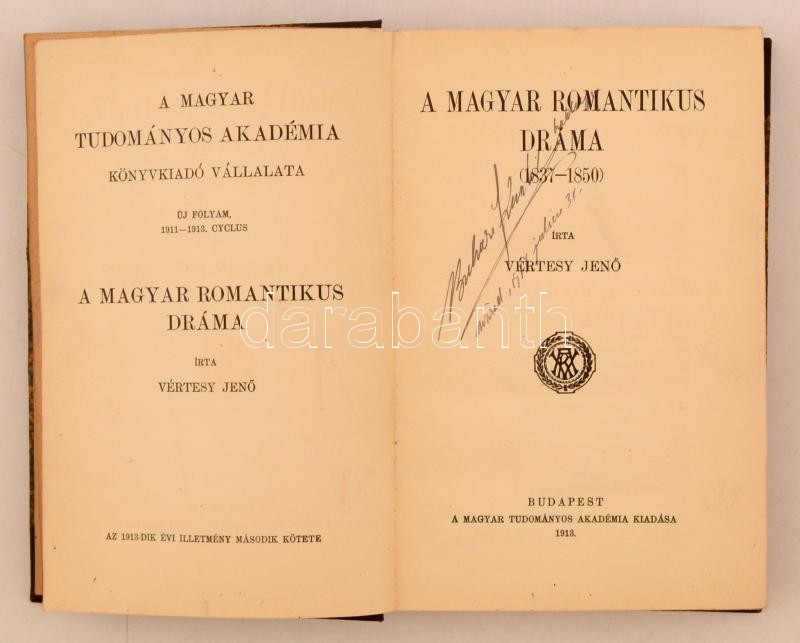 Vértesy Jenő: A magyar romantikus dráma(1837-1850). Bp., 1913, Magyar ... https://www.darabanth.com/de/277-Fernauktion/277.0/Bucher/Bucher-Sonstige-Raritaten~45/Vertesy-Jeno-A-magyar-romantikus-drama1837-1850-Bp-1913-Magyar-Tudomanyos-Akademia-fel~II1417353