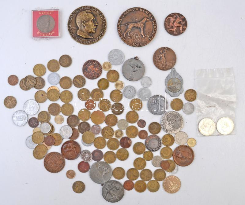 Vegyes fémpénz, díjérem, bárca és plakett tétel ~0,9kg súlyban, közte Edvi Illés György (1911-) 1939. "Prof. Verebély Tibor 1914-1939 Medicina Ars Divina, Medicus Homo Caducus" Br plakett (68mm), 1993. 200Ft Ag "MNB", 1994. 200Ft Ag "Deák", 1868KB 1kr Cu "Angyalos címer" T:vegyes