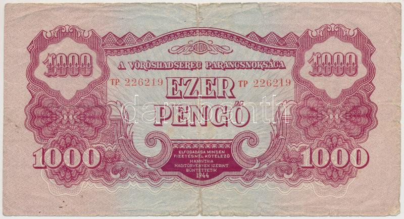 Beschreibung: 1944. 1000P "A Vöröshadsereg Parancsnoksága" T:III- szakadás