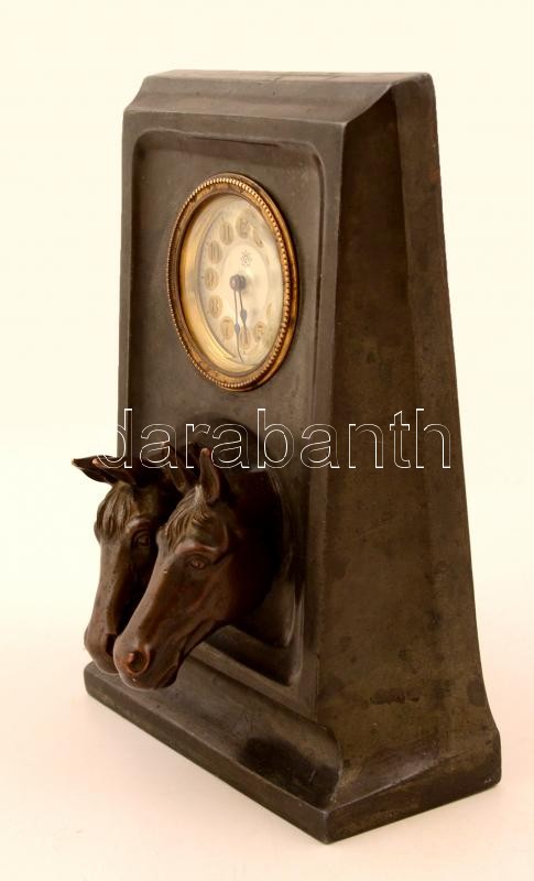 Beschreibung: cca 1910 Bronz asztali óra lovas domborművel, működő Junhghans szerekezettel, szép állapotban / Bronze table clock with horse motives 12x22 cm