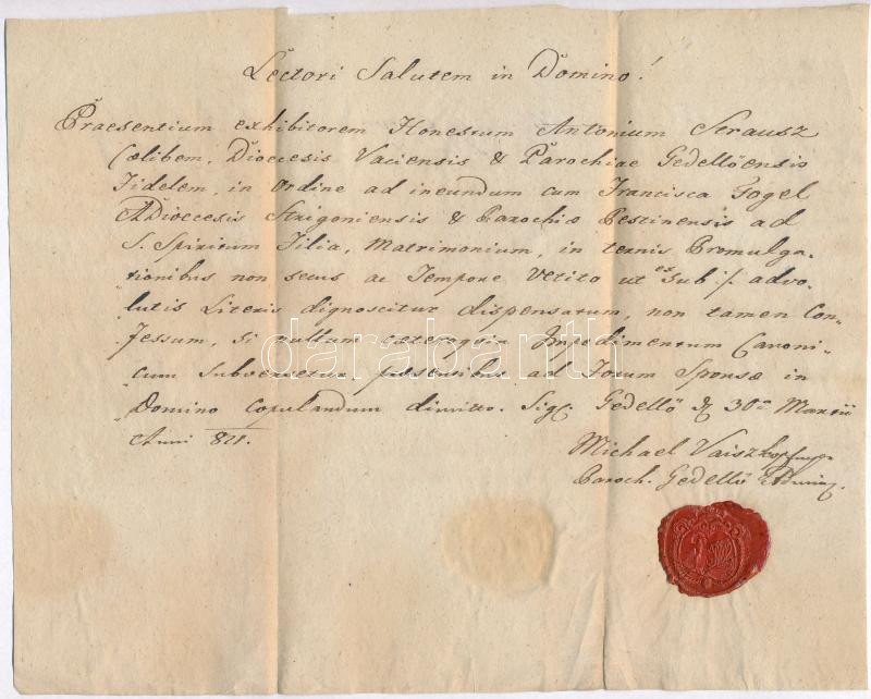 1821 Vaiszkopf Mihály gödöllői, később hatvani plébános által aláírt ... https://www.darabanth.com/de/278-Fernauktion/278.0/Andere-Sammelgebiete/Dokument~37/1821-Vaiszkopf-Mihaly-godolloi-kesobb-hatvani-plebanos-altal-alairt-es-pecsetelt-irat~II1414641