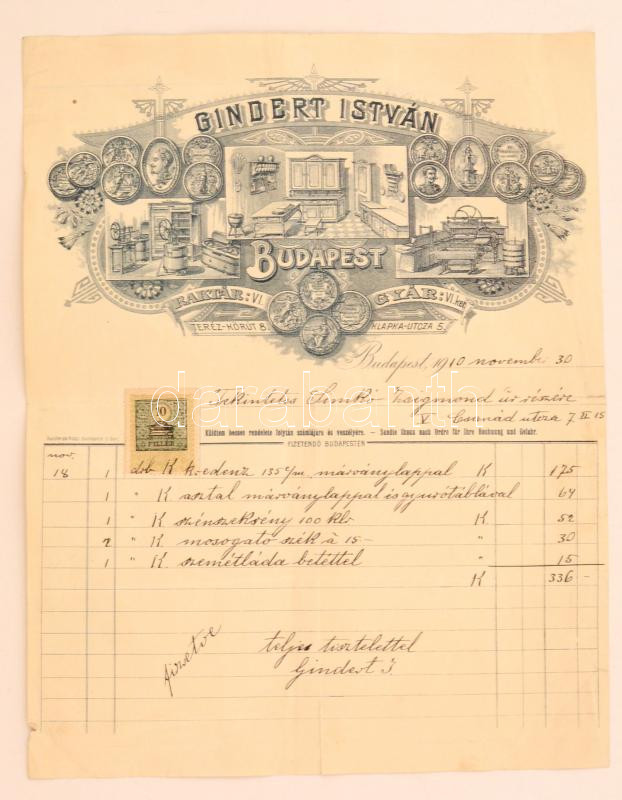 1910 Bp., Gindert István Bútorgyárának díszes fejléces számlája 10 fil... https://www.darabanth.com/de/278-Fernauktion/278.0/Andere-Sammelgebiete/Dokument~37/1910-Bp-Gindert-Istvan-Butorgyaranak-diszes-fejleces-szamlaja-10-filler-okmanybelyeggel~II1428942